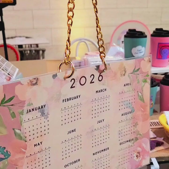 كلندر معلق للعام 2026 مع سلسلة ذهبية أنيقة _ زهور بألوان دافئة